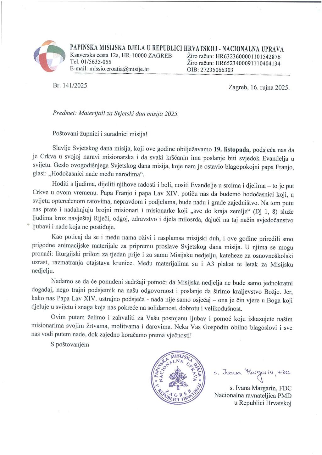 Više informacija pročitajte u dopisu (pozivu na sudjelovanje) u privitku, koji potpisuje s. Ivana Margarin, Nacionalna ravnateljica PMD u RH.