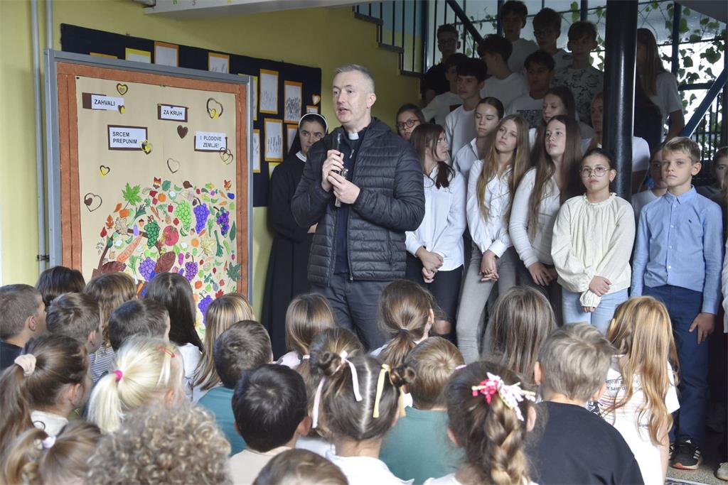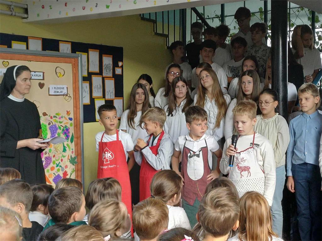 Na početku priredbe, pod vodstvom s. Mare, pjesma naših radosnih i raspjevanih osmaša i petaša odjekivala je iz njihovih mladenačkih srdaca prostorima škole. Pjesmom su zahvaljivali Bogu za svu dobrotu koju nam daje i slavili Krista, svoga Prijatelja i Učitelja. Učenici su pod vodstvom učiteljice Marite Škanata i vjeroučiteljice Violete Raguž izveli predivne recitacije i tako nas potaknuli i pozvali na dobrotu i zahvalnost Bogu i čovjeku. Uslijedila je zajednička pjesma „Mi želimo uzdić Isusa“ koju smo svi zapjevali uz pokrete, a koje je učenike naučila vjeroučiteljica Violeta.