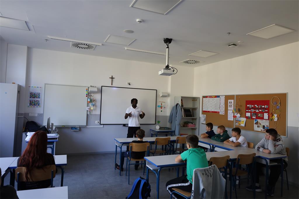 Na prošlom satu izvannastavne aktivnosti u posjet nam je došao Alain, mladić star 21 godinu koji je sam, bez roditelja sa 16 godina otišao iz Konga jer je morao. Pričao nam je o svom životnom iskustvu, dolasku u Hrvatsku, kako su mu ljudi iz JRS Hrvatske pomogli da se snađe, nauči jezik, završi školu. Alain sada radi i sprema se upisati fakultet. Učenicima je govorio o svojoj zemlji, situaciji u njegovoj domovini, zanimljivostima i sl. Otkrio je i kako voli našu kuhinju, posebno sarmu.