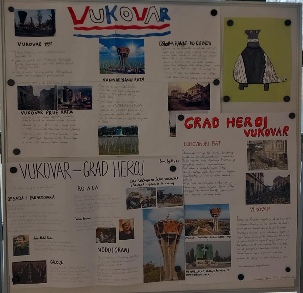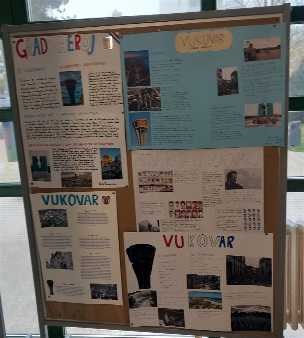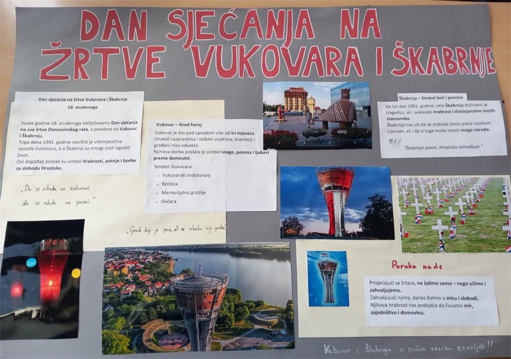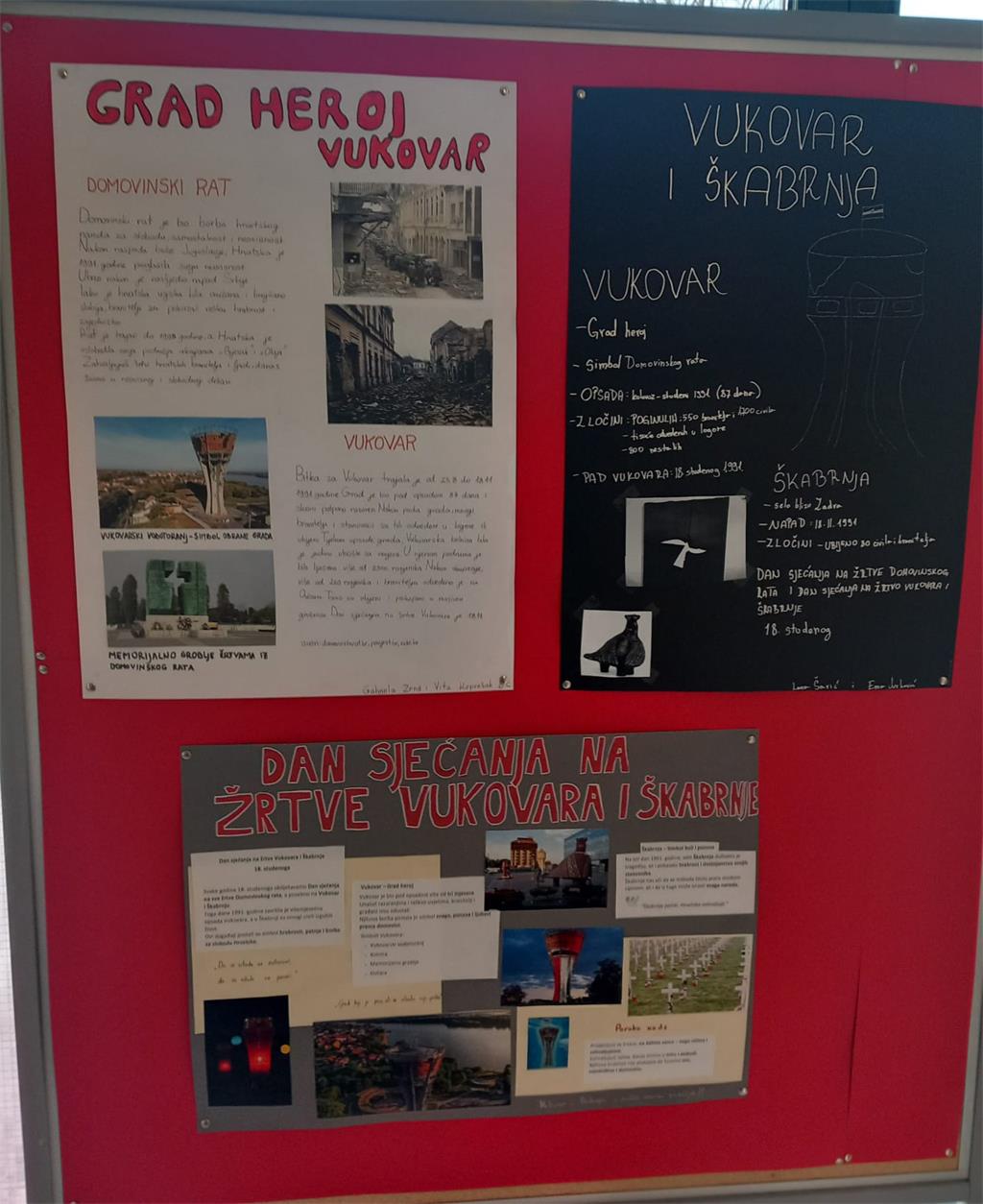 Učenici su na povijesti mogli poslušati predavanja o žrtvama Domovinskog rata, Vukovara i Škabrnje. Postavljena su razno razna pitanja, dani odgovori s obrazloženjima. Puno se promišljalo i debatiralo, a potom su izrađeni prigodni plakati i prezentacije koji su izloženi u predvorju škole.