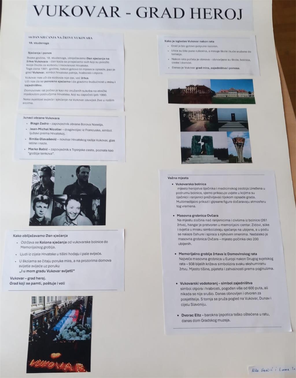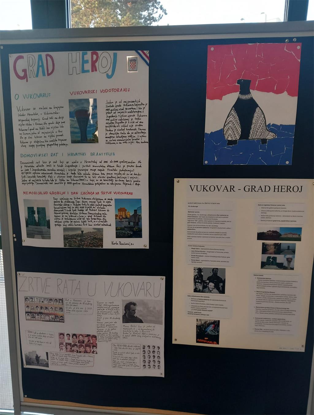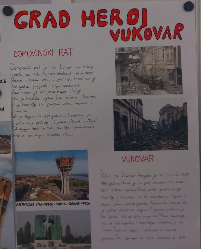 Učenici su na povijesti mogli poslušati predavanja o žrtvama Domovinskog rata, Vukovara i Škabrnje. Postavljena su razno razna pitanja, dani odgovori s obrazloženjima. Puno se promišljalo i debatiralo, a potom su izrađeni prigodni plakati i prezentacije koji su izloženi u predvorju škole.