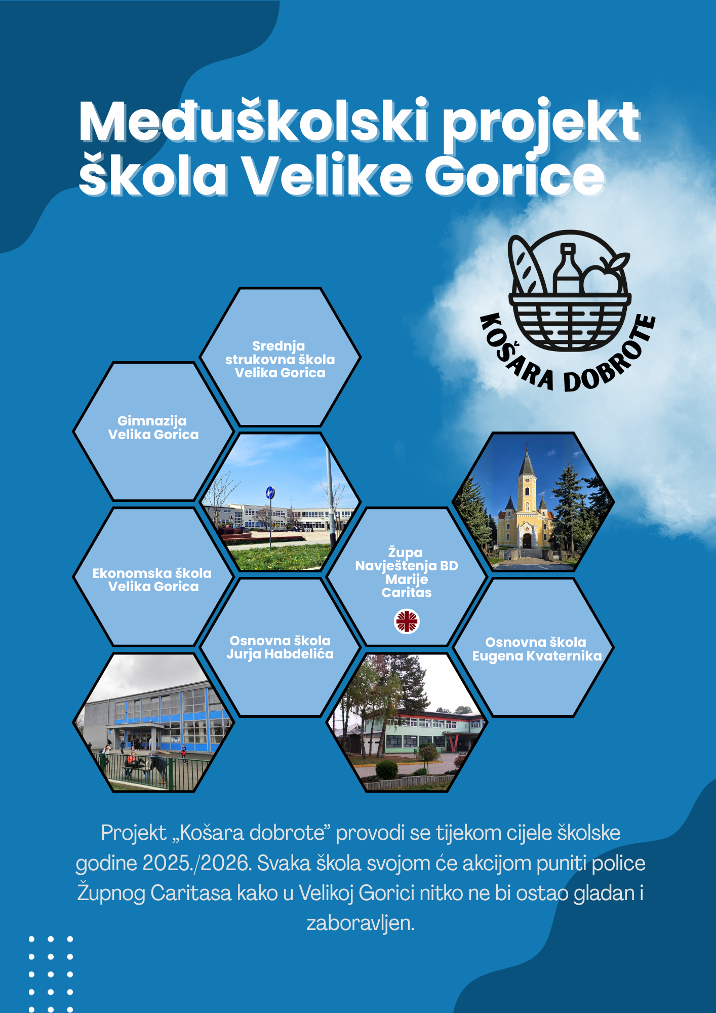 Projekt „Košara dobrote” provodi se tijekom cijele školske godine 2025./2026. Svaka škola svojom će akcijom puniti police Župnog Caritasa kako u Velikoj Gorici nitko ne bi ostao gladan i zaboravljen.