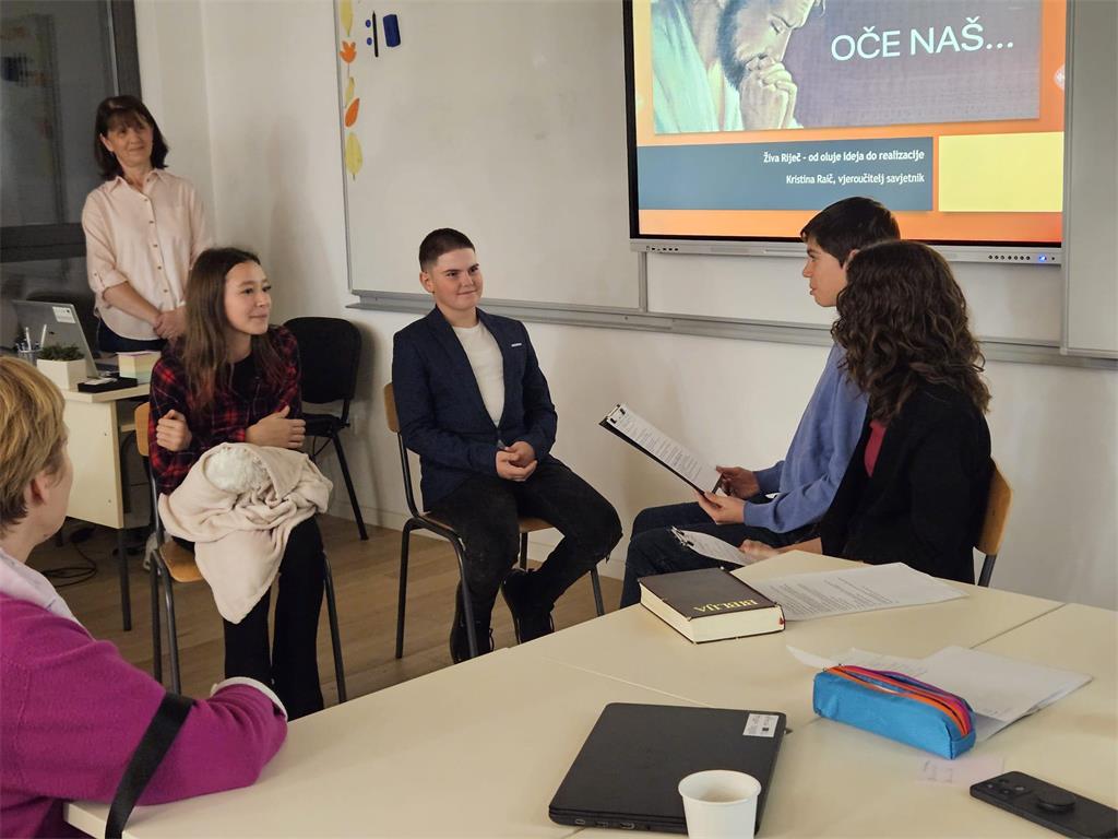 Vjeroučiteljica Kristina Raič na temu Živa Riječ - od oluje ideja do realizacije sa svojim učenicima 7. razreda je predstavila primjer dobre prakse, molitvu Oče naš kao dijalog s Bogom koji nas poučava kako moliti. Bilo je poticajno, maštovito i kreativno.