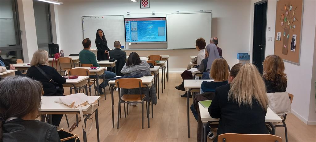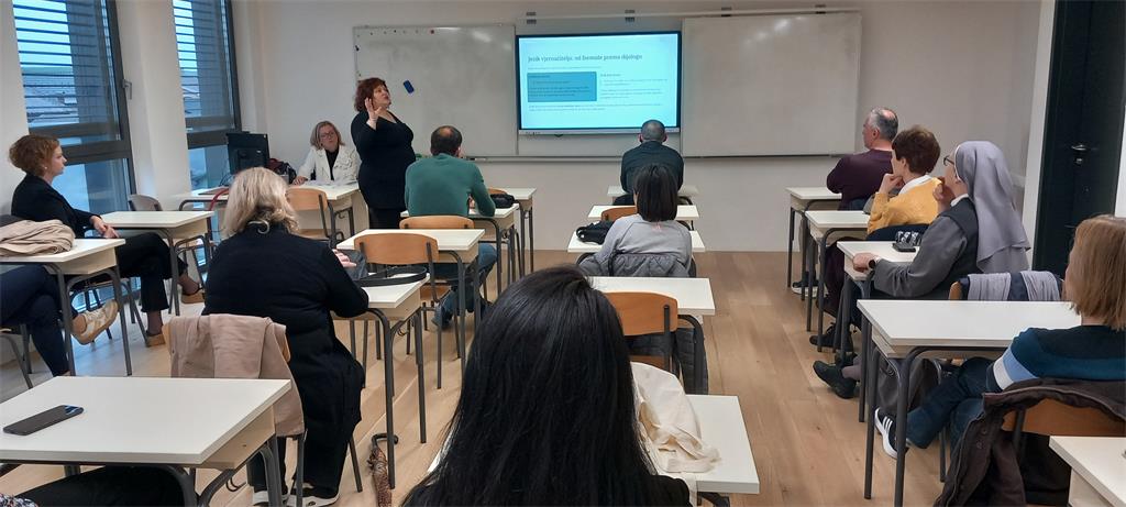 Predavanje na temu „Škola i župa u dijalogu: jezik i metode vjeroučitelja u izgradnji moderne nastave“ održale su kolegice Nataša Čurić i Martina Filipović. Predavanje je bilo usmjereno na jačanje suradnje između škole i župe. Poseban naglasak stavljen je na konkretne primjere iz prakse koji mogu povezati ta dva odgojna prostora. Istaknuta je važnost župnog katehetskog tima koji zajednički planira i provodi aktivnosti. Navedeni su konkretni projekti, poput školskih ili župnih inicijativa koje povezuju učenike s praktičnim životom vjere. Takvi projekti omogućuju učenicima aktivno sudjelovanje i razvijanje osjećaja pripadnosti. Kroz predavanje je istaknuto da je za modernu nastavu vjeronauka ključno povezivanje teorije i prakse. Kvalitetan dijalog između škole i župe, uz primjenu suvremenog jezika i metoda, omogućuje vjeroučitelju da učenicima približi vjeru na autentičan i razumljiv način. Suradnja, otvorenost i kreativnost pritom su temelj uspješnog odgojno-obrazovnog djelovanja.