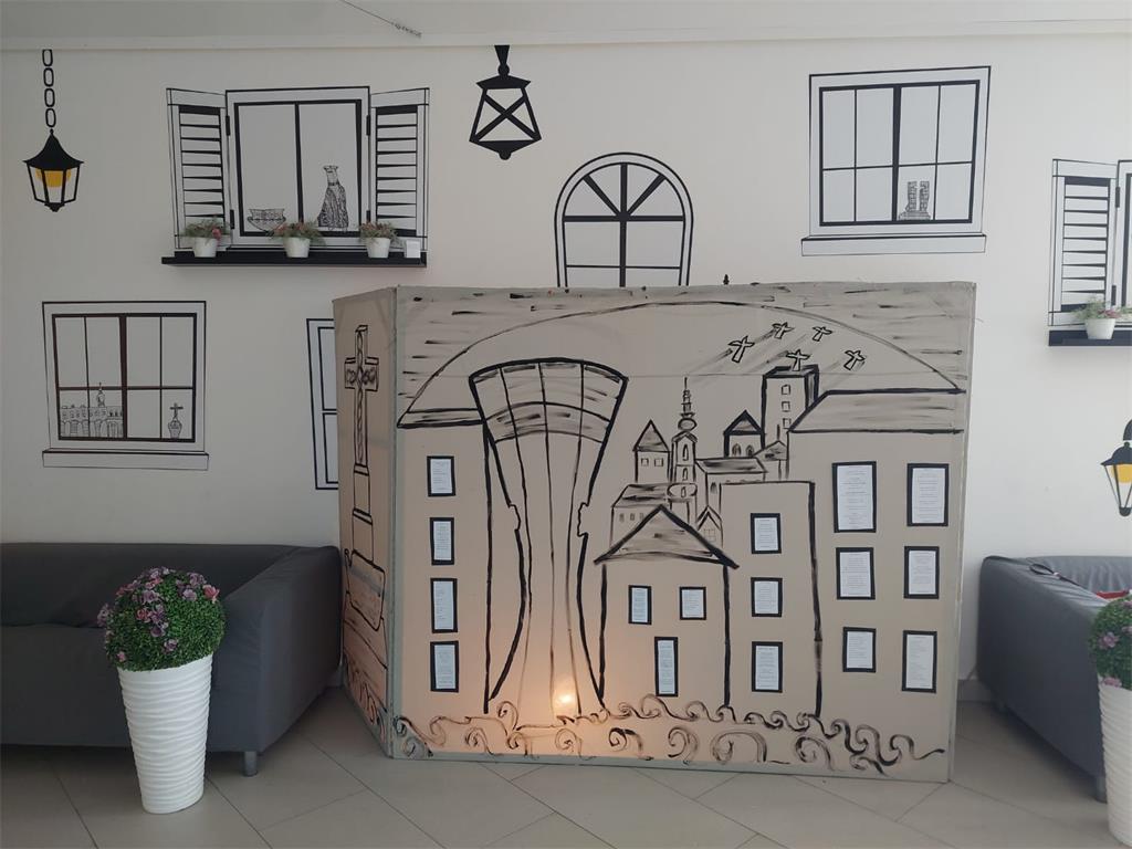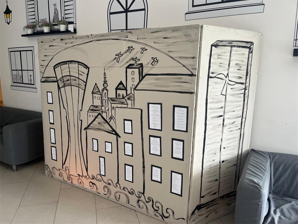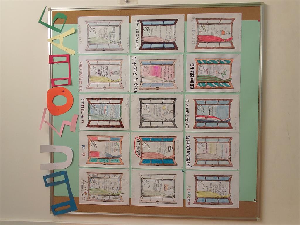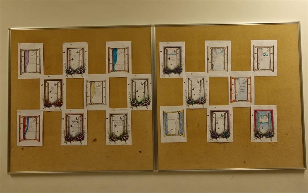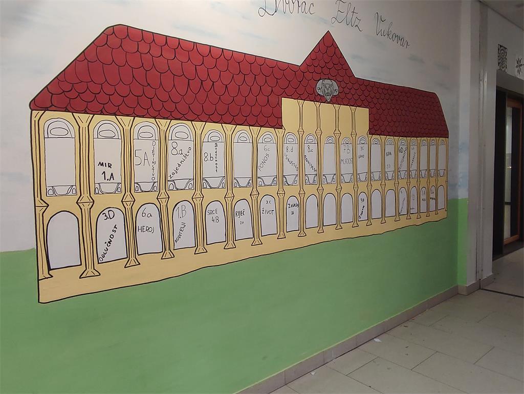 U predvorju su škole na platnu oslikani obrisi grada Vukovara, a prozore su zamijenili literarni radovi učenika. U hodniku škole učenici su naslikali Dvorac Eltz i golubicu. U svaki je prozor Dvorca predstavnik razrednog odjela upisao jednu riječ koja simbolizira snagu i junaštvo branitelja i grada Vukovara i Škabrnje. U svojim su učionicama, kroz motive različitih priča (o igri, zagrljaju, obitelji, djetinjstvu, roditeljima, ljubavi, gradovima, snazi, dostojanstvu, slobodi…), učenici pisali i slikali o važnim životnim stvarima i istaknuli koliko je važno živjeti u miru i slobodi. Njihovi su radovi postali dio pogleda s vukovarskog prozora.