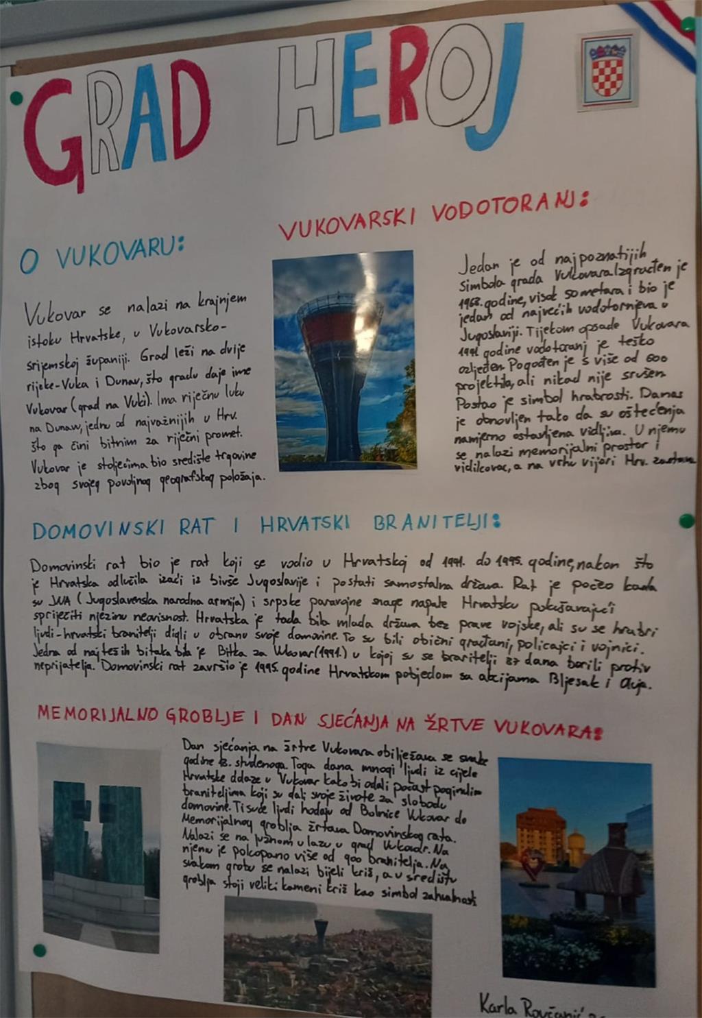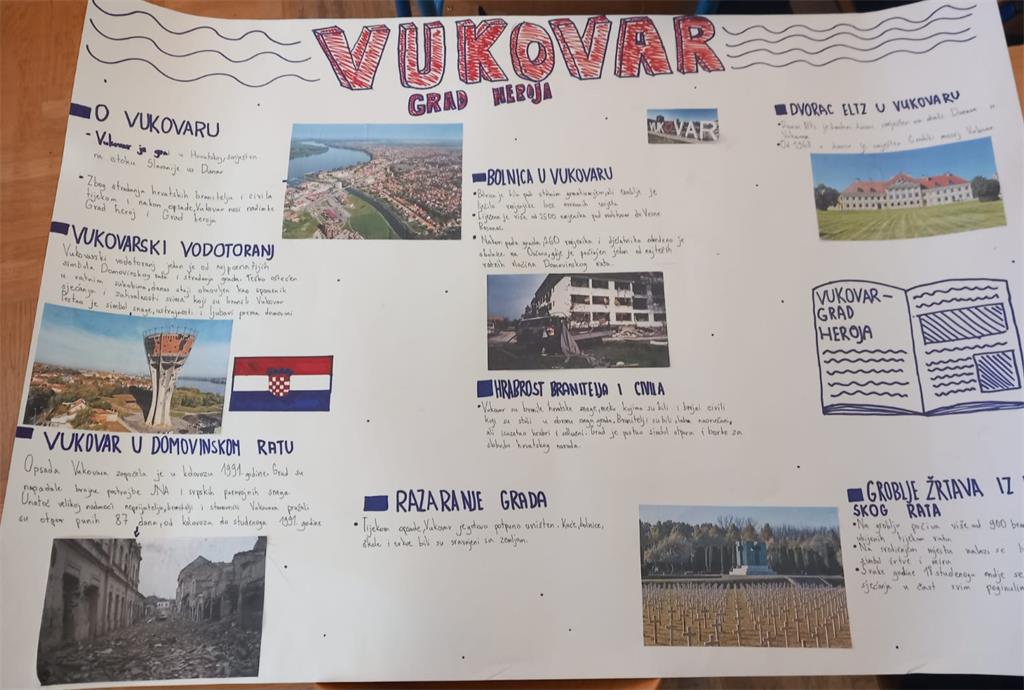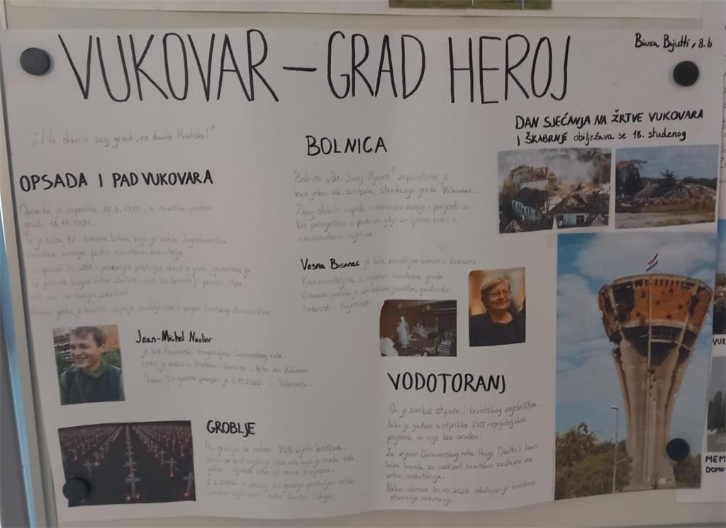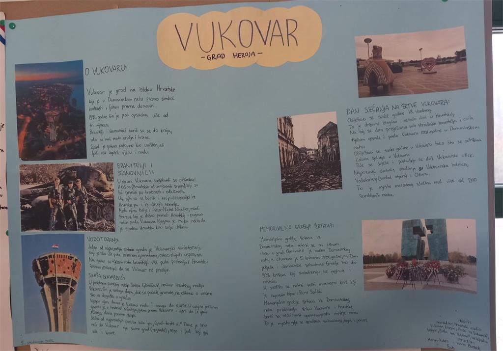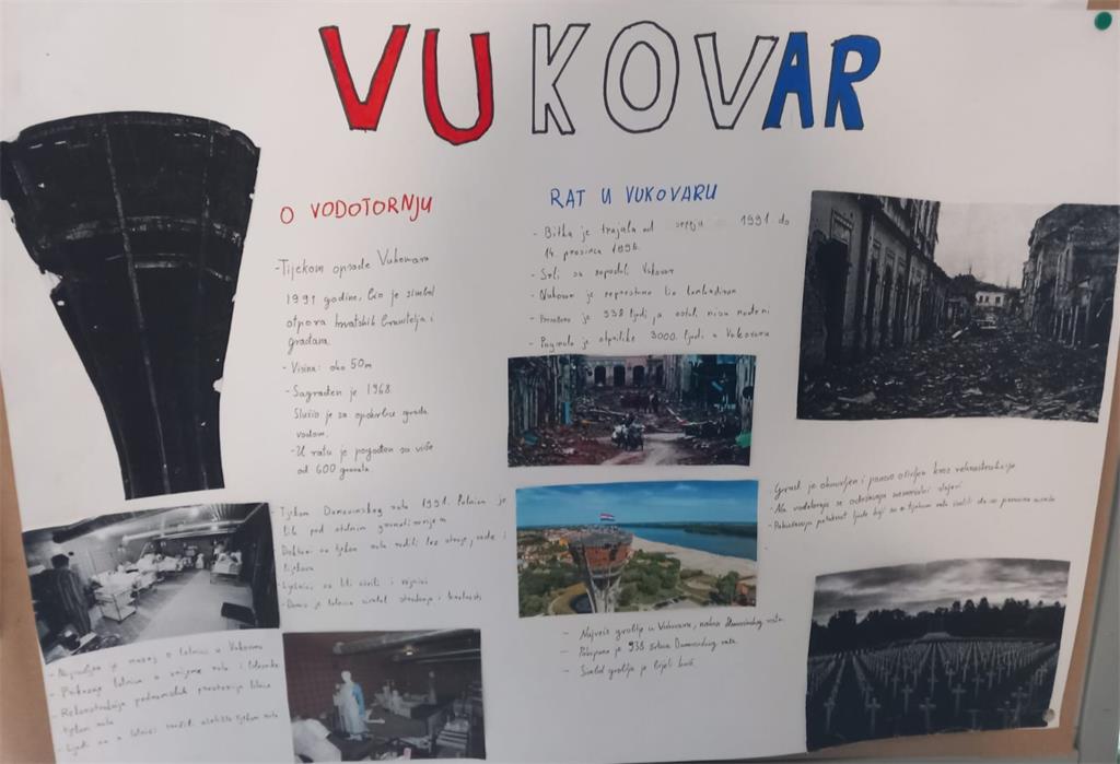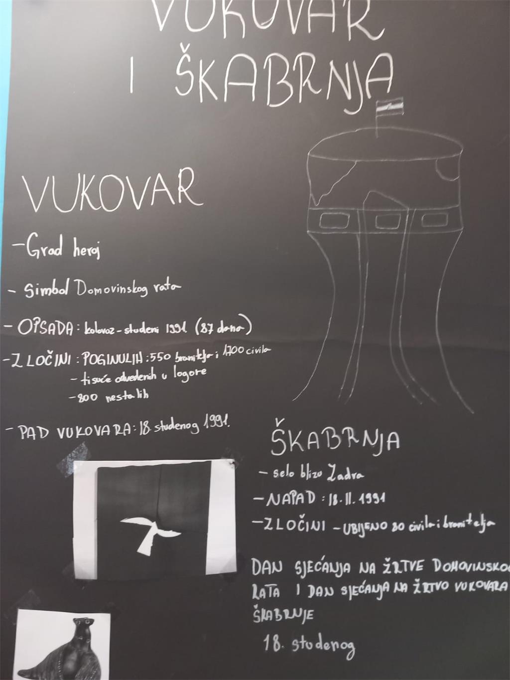 Učenici su na povijesti mogli poslušati predavanja o žrtvama Domovinskog rata, Vukovara i Škabrnje. Postavljena su razno razna pitanja, dani odgovori s obrazloženjima. Puno se promišljalo i debatiralo, a potom su izrađeni prigodni plakati i prezentacije koji su izloženi u predvorju škole.