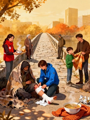 [ILUSTRACIJA prispodobe o dobrom Samarijancu u modernom kontekstu pomoći migrantima, siromašnima i marginaliziranim.]