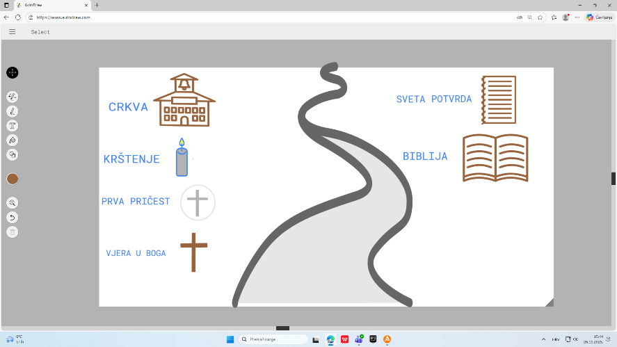 Nakon obrađene teme Abraham - otac mnogih naroda u 5. razredu, učenici su u alatu Auto Draw prikazivali svoj osobni “put vjere” koristeći simbole, jednostavne ilustracije i ključne riječi koje za njih predstavljaju povjerenje u Boga, hod kroz život, izazove, prepreke i trenutke radosti. Radovi su zatim predstavljeni u razredu: svaki je učenik usmeno objasnio svoj crtež, opisao zašto je odabrao određene simbole te kako oni prikazuju njegov osobni odnos s Bogom. Ovakav način rada potaknuo je međusobnu razmjenu, slušanje i poštovanje različitih iskustava vjere.