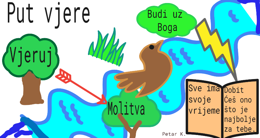 Ovaj učenik prikazao je put vjere kao rijeku koja teče, a uz nju se pojavljuju važni simboli: drvo s riječju Vjeruj, ptica koja simbolizira slobodu i Božju blizinu, knjiga s porukama Sve ima svoje vrijeme i Dobit ćeš ono što je najbolje za tebe, te stablo označeno riječju Molitva. Učenik je objasnio da mu rijeka predstavlja život koji ponekad skreće, ali uvijek teče dalje, dok mu molitva i povjerenje daju snagu. Objasnio je i da se, poput Abrahama, nastavlja oslanjati na Božje vodstvo.